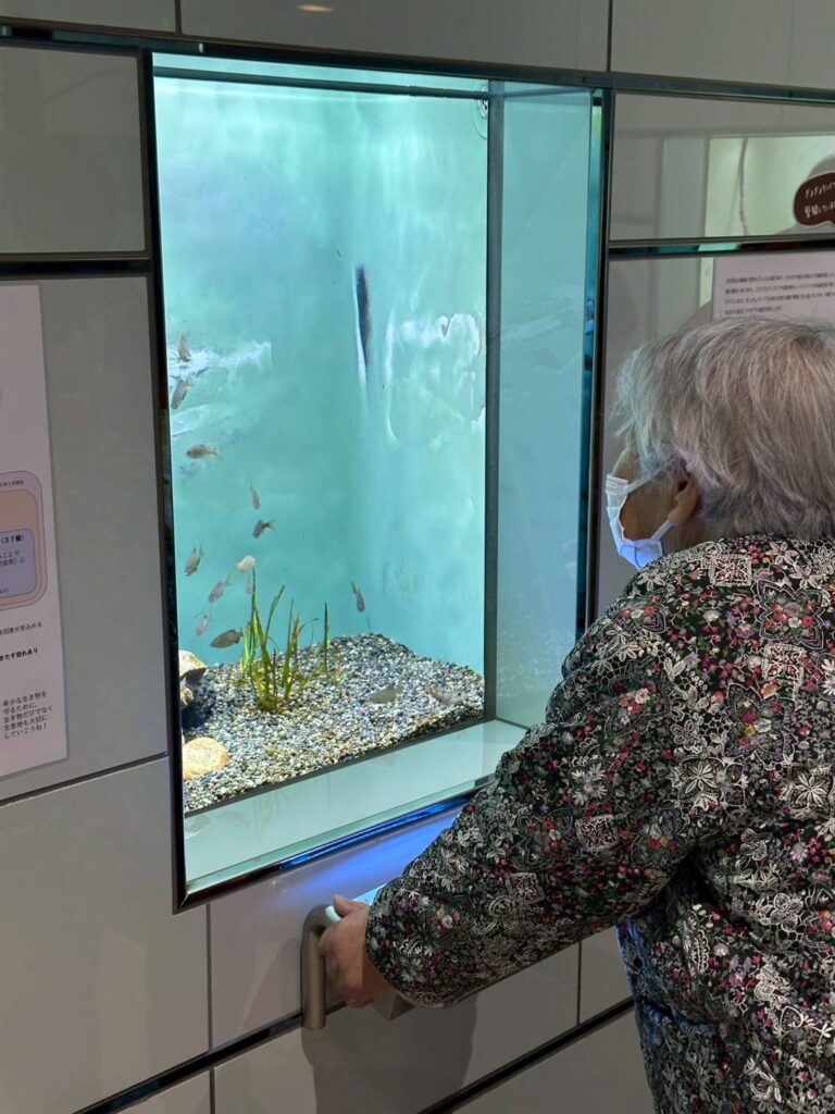 暖かい日には、地域の公共施設へ出かけ、外出を兼ねた歩行訓練を行っています。